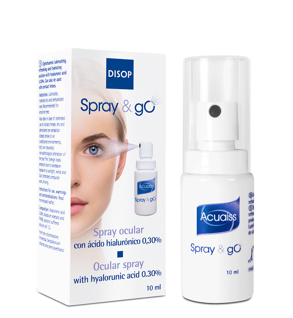 Acuaiss Spray & Go é uma solução com elevada percentagem de ácido hialurónico (0,30%), que lubrifica, hidrata e refresca os olhos secos e irritados. O seu pH e osmolaridade são fisiológicos, ou seja, muito semelhantes aos da própria lágrima, pelo que é muito bem tolerado pelos utilizadores.